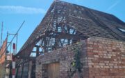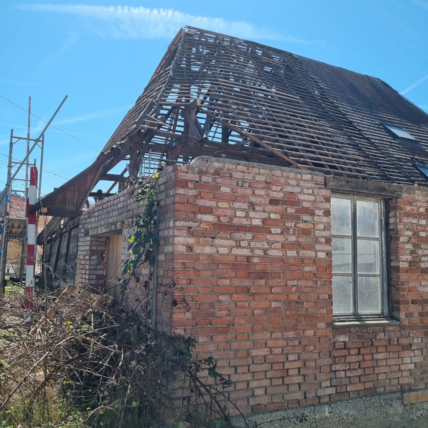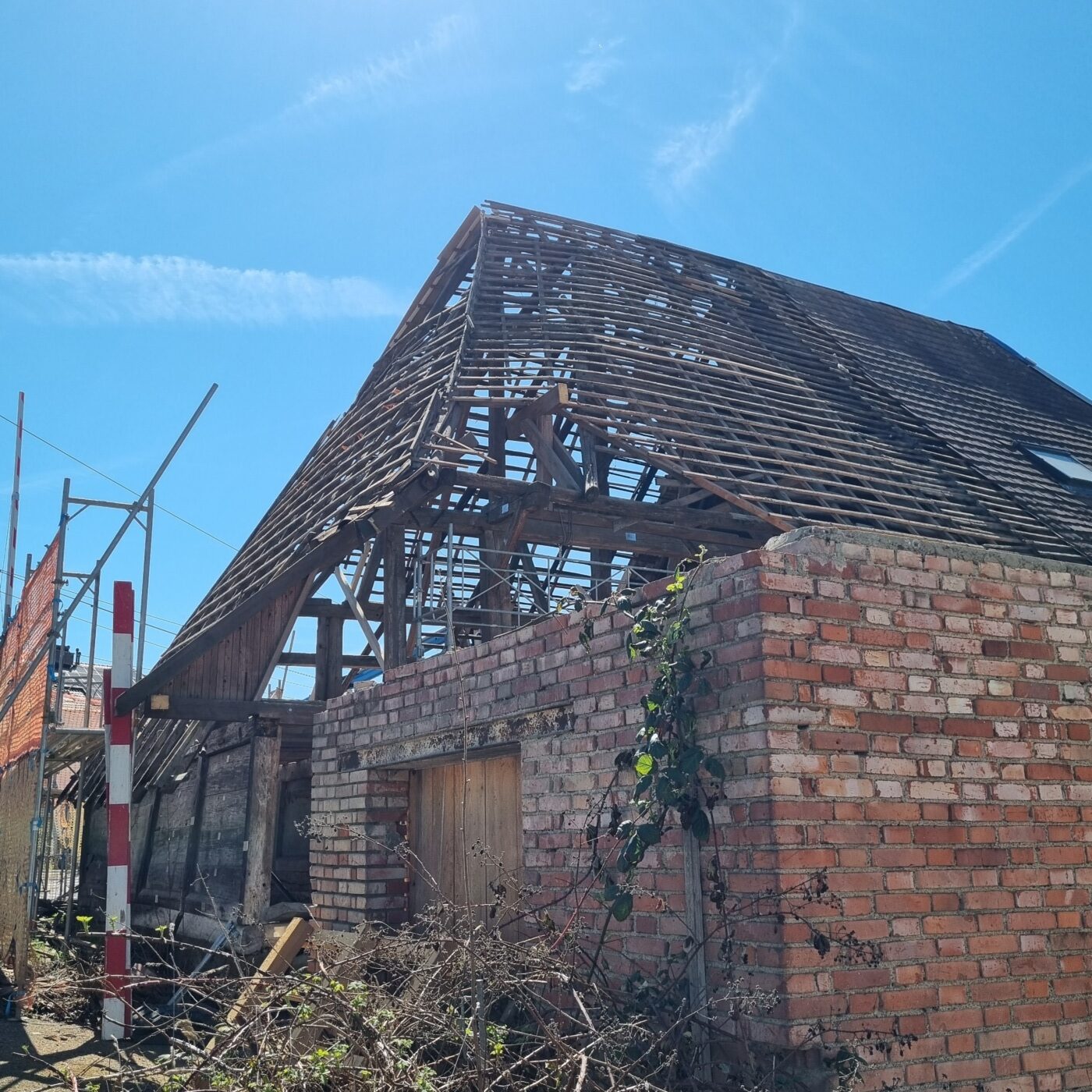Bei einem Bauwerk dieser Zeit treten während des Rückbaus immer wieder Überraschungen auf. Schäden durch Feuchtigkeit, Holzschädlinge oder frühere Umbauten erfordern individuelle Lösungen. Im Stallbereich führte beispielsweise eine Kombination aus Setzungen und Materialermüdung zu einer Verdrehung der Konstruktion. Anstatt Bauteile vollständig zu ersetzen, entwickeln wir Lösungen, die den Bestand stabilisieren und gleichzeitig möglichst viel originale Substanz erhalten.