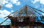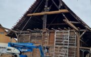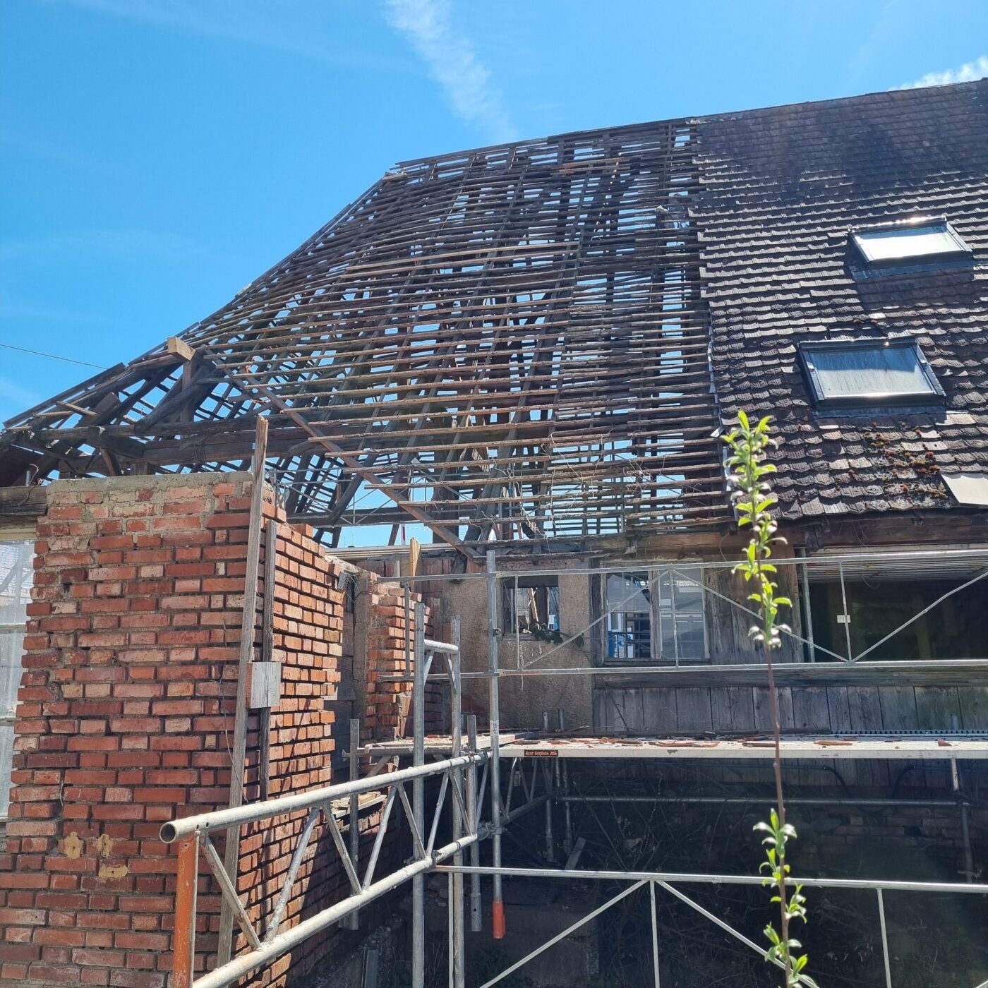Im Zentrum unserer Arbeiten steht der bewusste Umgang mit der bestehenden Substanz. Ziel ist es, so viel wie möglich zu erhalten und nur dort einzugreifen, wo es konstruktiv notwendig ist. Gerade im Dachbereich zeigte sich der Handlungsbedarf deutlich. Die Umdeckung von einem leichten Strohdach auf schwere Ziegel führte über die Jahre zu statischen Problemen. Verschobene Balken, gelöste Verbindungen und ein gebrochener First waren die Folge. Beim Rückbau erfassen wir jedes Bauteil systematisch, dokumentieren den Zustand und bereiten die Elemente für den späteren Wiederaufbau vor. Wo erforderlich, werden Bauteile ersetzt oder verstärkt, immer mit dem Anspruch, die ursprüngliche Bauweise nachvollziehbar zu erhalten.