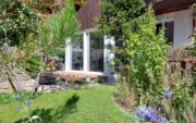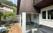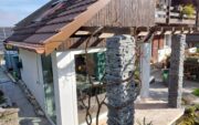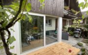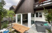 Die Grundlage bildete das bereits vorhandene grosse Sitzplatzvordach, daraus entstand ein erweiterter Wohnraum, der so gestaltet wurde, als wäre er schon immer Teil des Hauses gewesen.
