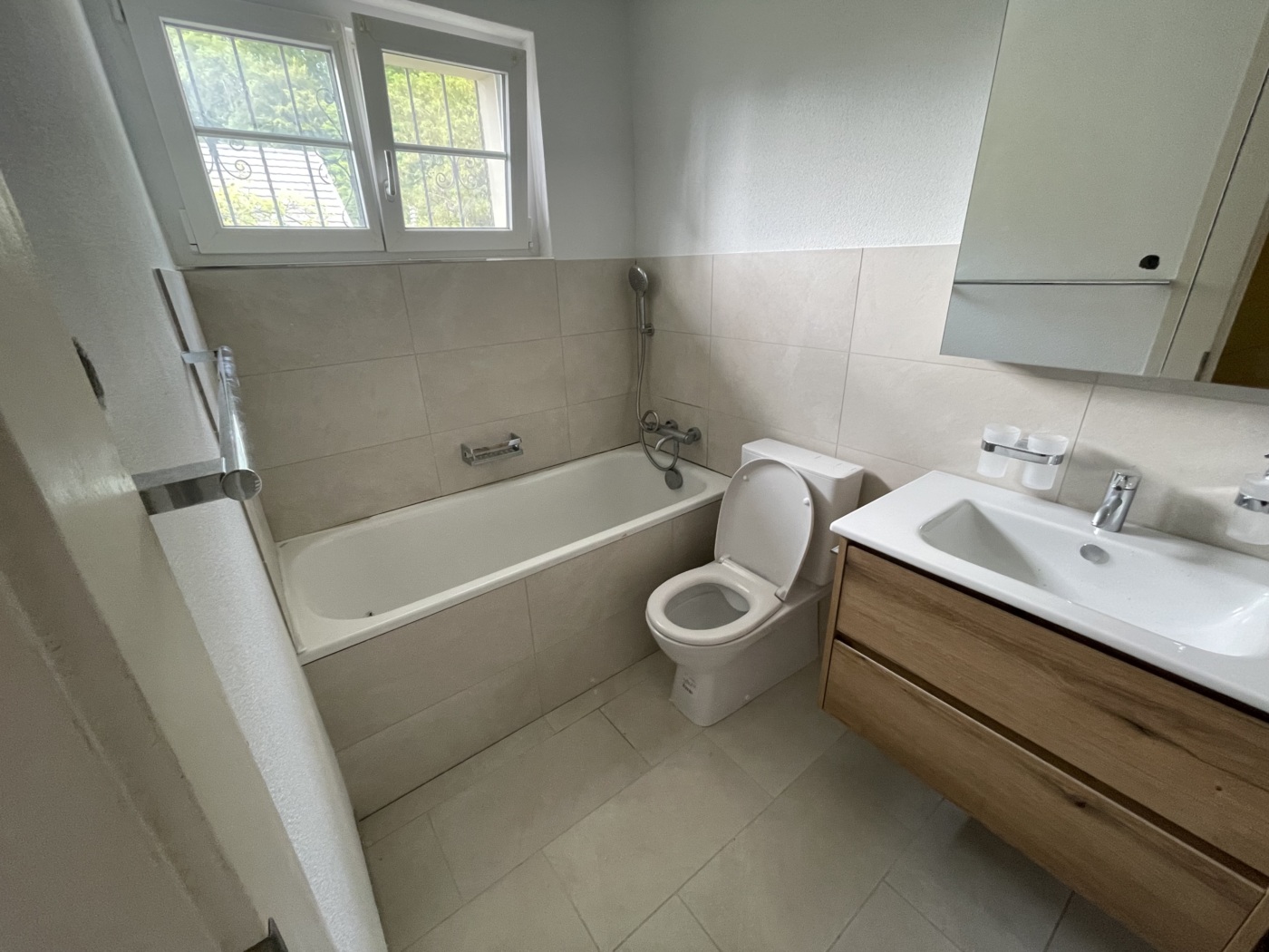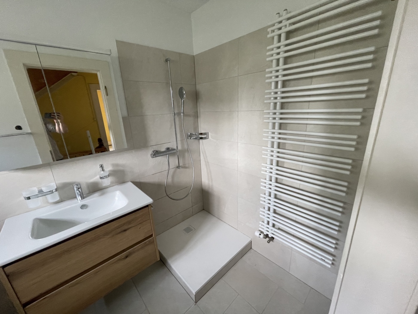 In der Planung wurde der vorhandene Raum optimal genutzt, um trotz begrenzter Fläche ein vollwertiges und modernes Badezimmer zu schaffen. Die Kombination aus Badewanne und Dusche, klar strukturierten Möbeln und hellen Materialien sorgt für eine angenehme und praktische Nutzung im Alltag.